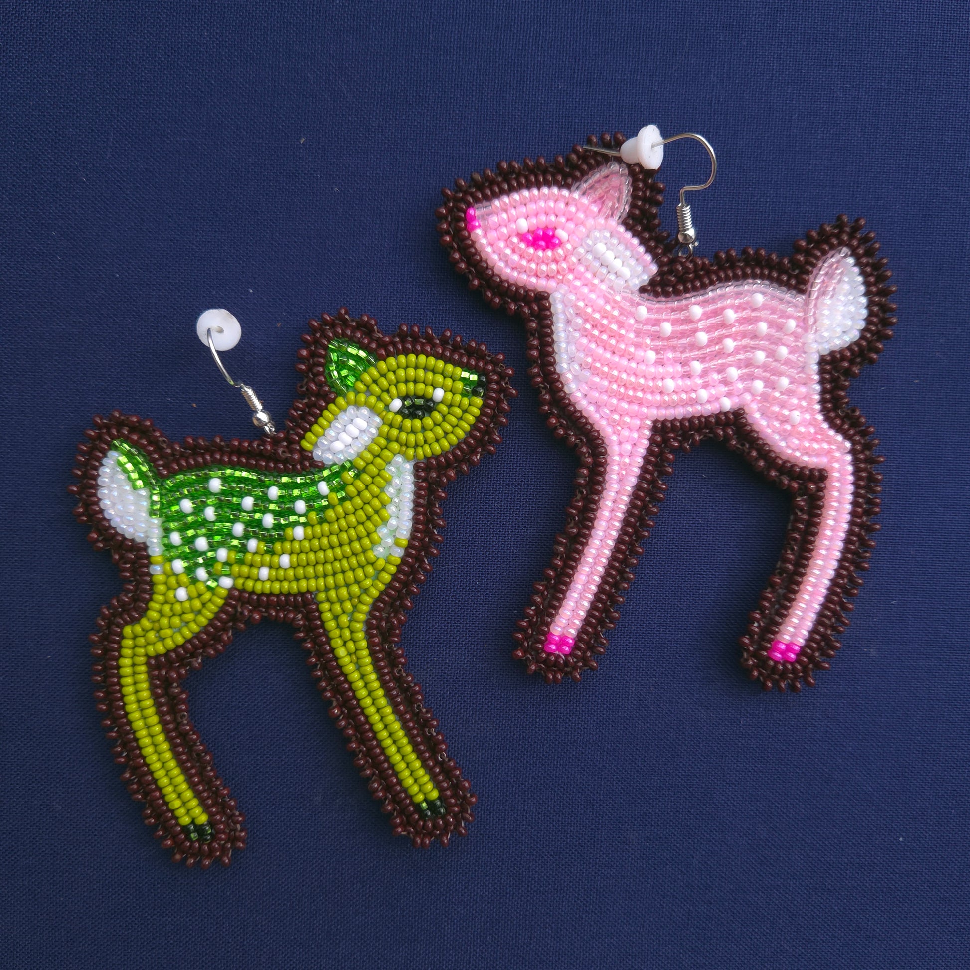 Mismatched green and pink fawns edged in a dark brown.